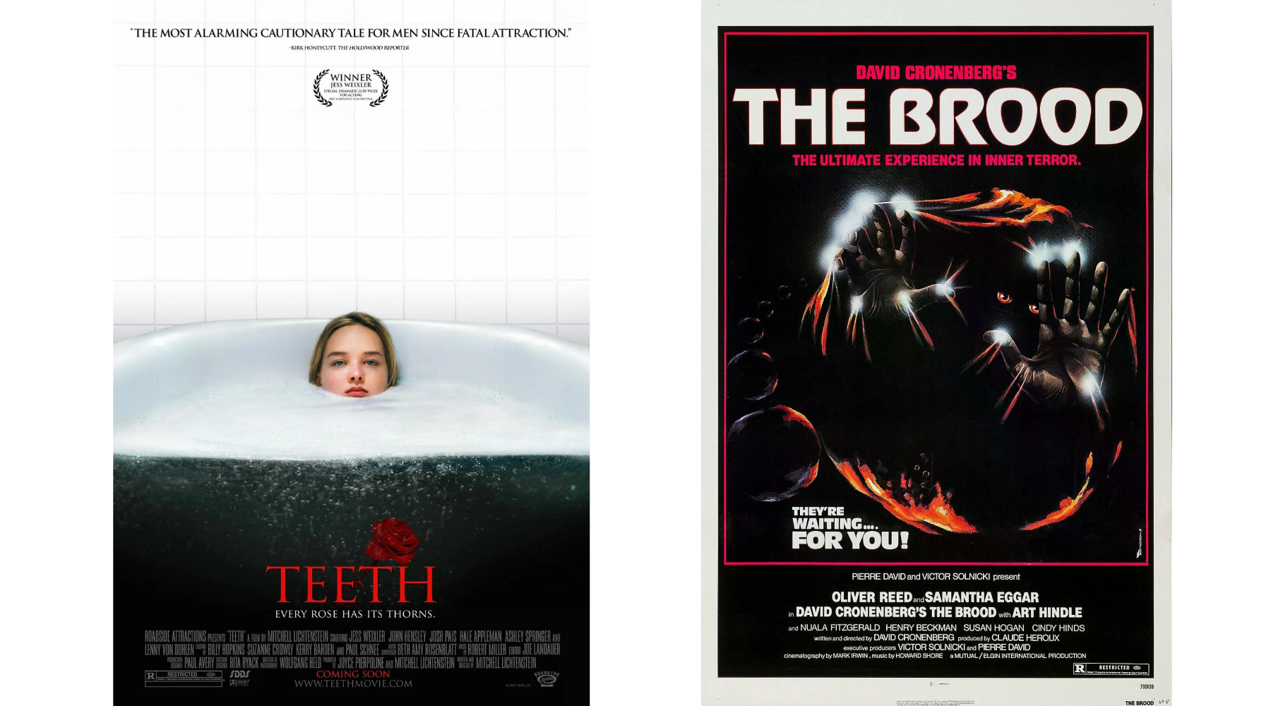 Картина «Зубы» Митчелла Лихтенштейна переосмысляет миф о vagina dentata («зубастой вагине»), отражающий страх о кастрации. Но фильм как ни парадоксально, не про страх мужчин, а про страх женщин. Главная героиня Донна сталкивается с насилием и проявлением нежелательного внимания на каждом шагу, поэтому все, что она делает, — защищается. Стыд, связанный с разговорами о гениталиях, соседствует с домогательствами во врачебном кабинете, клубом воздерживающихся от половой жизни школьников и постоянными разговорами о сексе. Донна проходит путь от напуганного своим телом подростка до девушки, хоть и разочарованной в мире, знающей, как за себя постоять. Другой фильм, рефлексирующий на тему ярости, стал боди-хоррор «Выводок» Дэвида Кроненберга. Режиссер показывает нам женщину после развода, проходящую курс психоплазматики, психотерапевтического метода при котором гнев человека проявляет себя физически. Гнев героини обретает физическую оболочку и буквально создает ей детей, готовых мстить за свою мать.