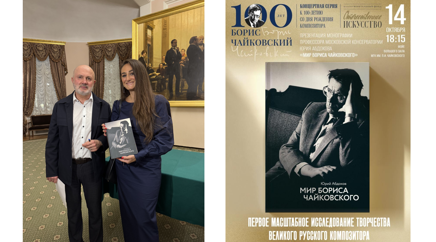 Юрий Борисович Абдоков и Алина Небыкова на презентации монографии «Мир Бориса Чайковского» в Большом зале Московской консерватории, октябрь 2025 года